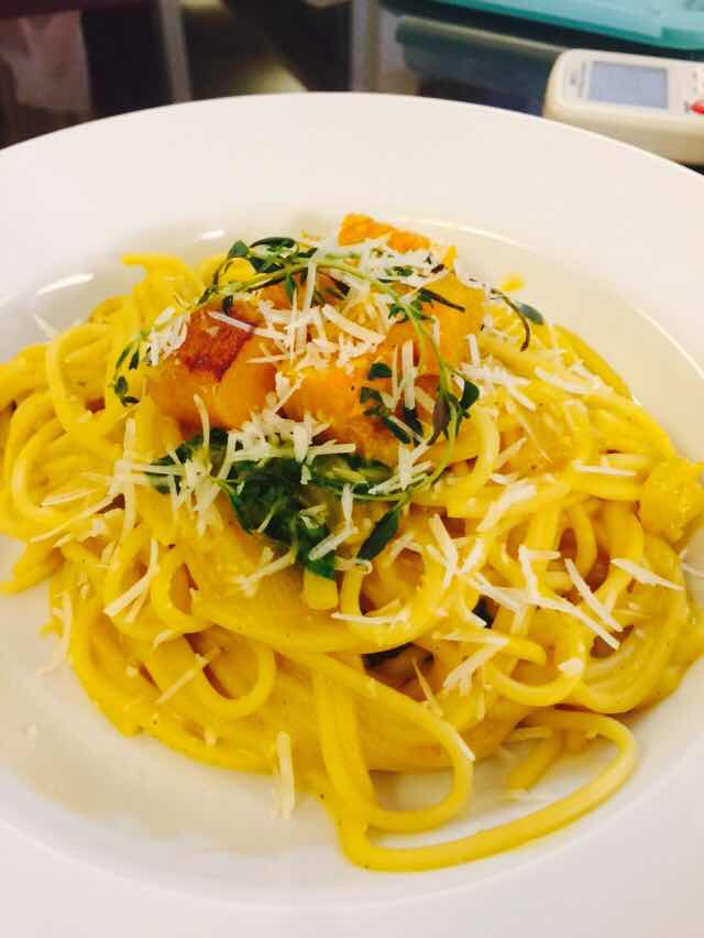 上碟,加入餘下的南瓜粒及額外份量的巴馬臣芝士碎。