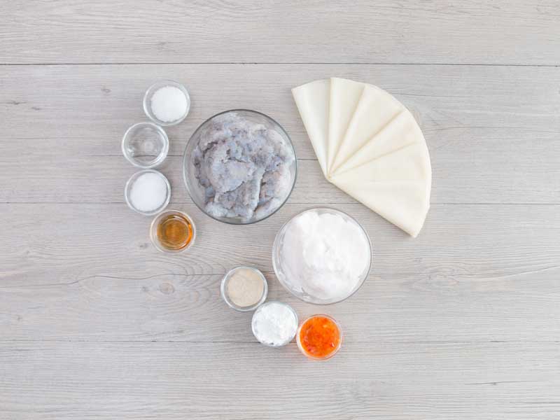 將蝦滑、墨魚滑、蛋白、鹽、胡椒粉、生粉、砂糖、米酒及麻油拌勻。