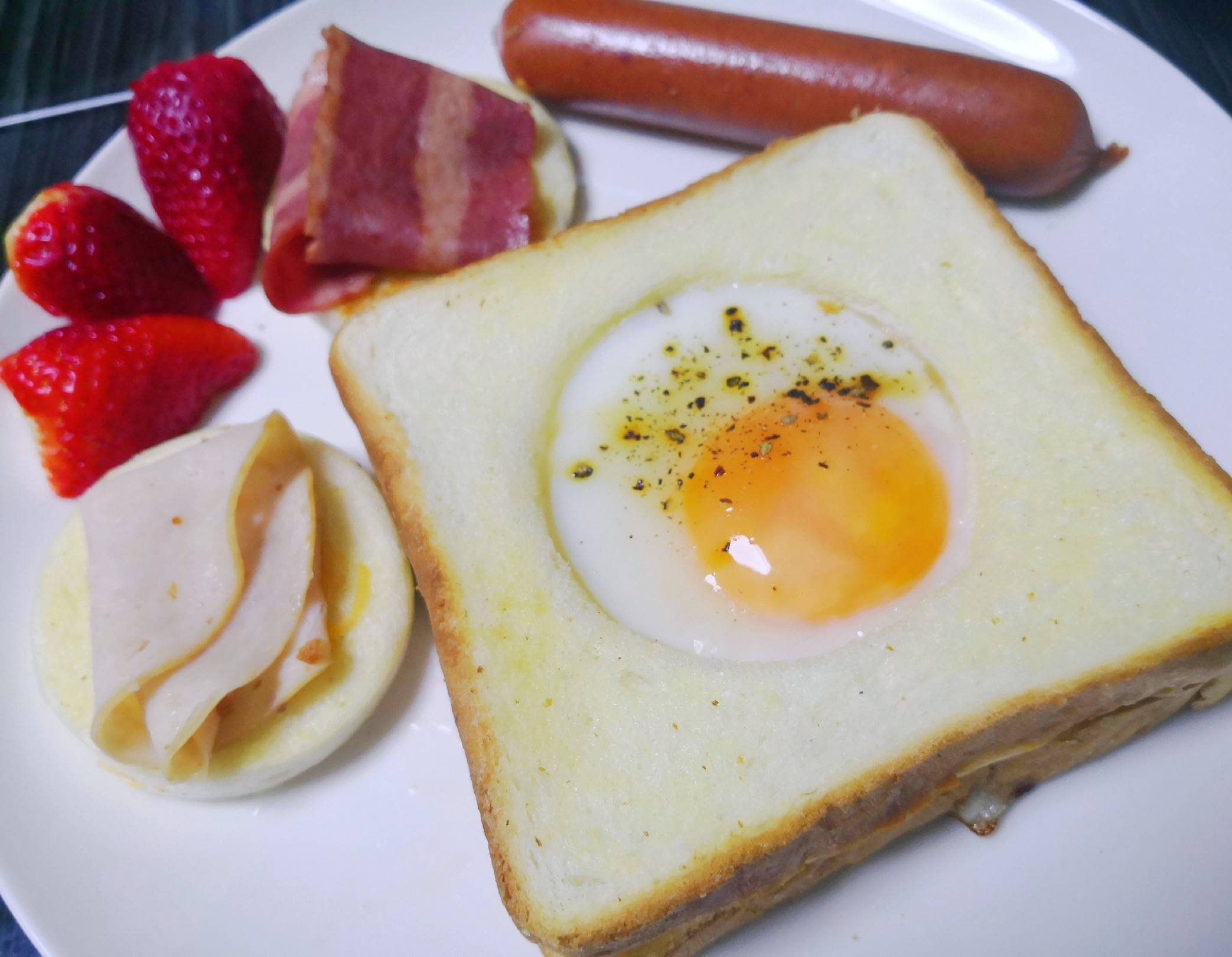 將有圓洞的麵包放在完整麵包上,在圓洞中加入雞蛋,加上鹽及黑胡椒調味,蓋上蓋煎至蛋白凝固及芝士溶化