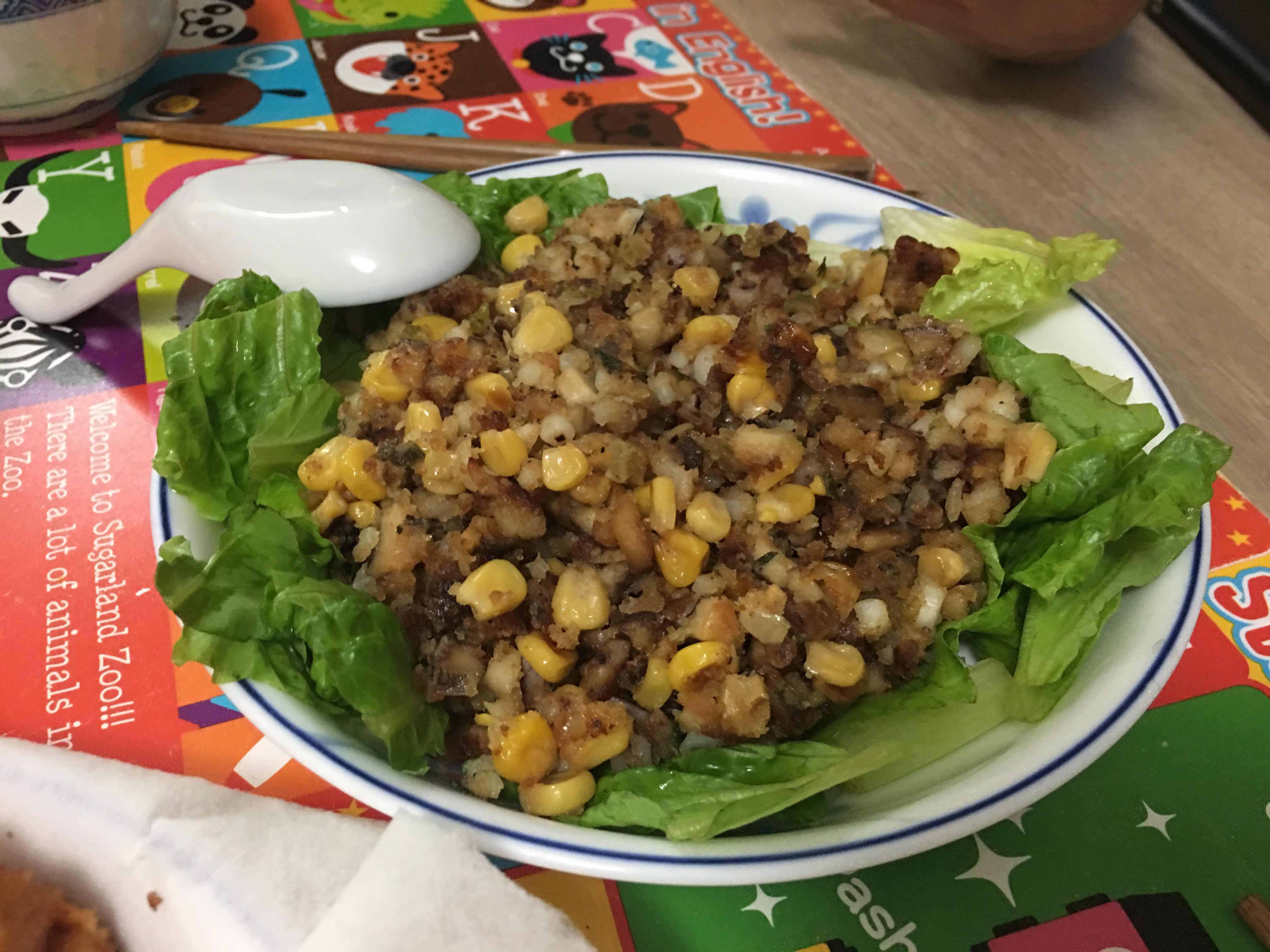 將洋蔥、墨魚滑、鮮冬菇、粟米粒、沙律醬、麵包糠、蔥粒、辣椒粉、鹽及胡椒粉拌勻