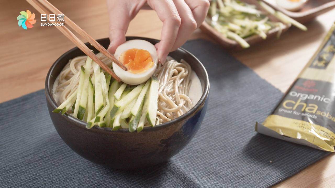 5.蕎麥麵放進碗,倒入醬汁,青瓜擺盤後放上半顆水煮蛋即完成。