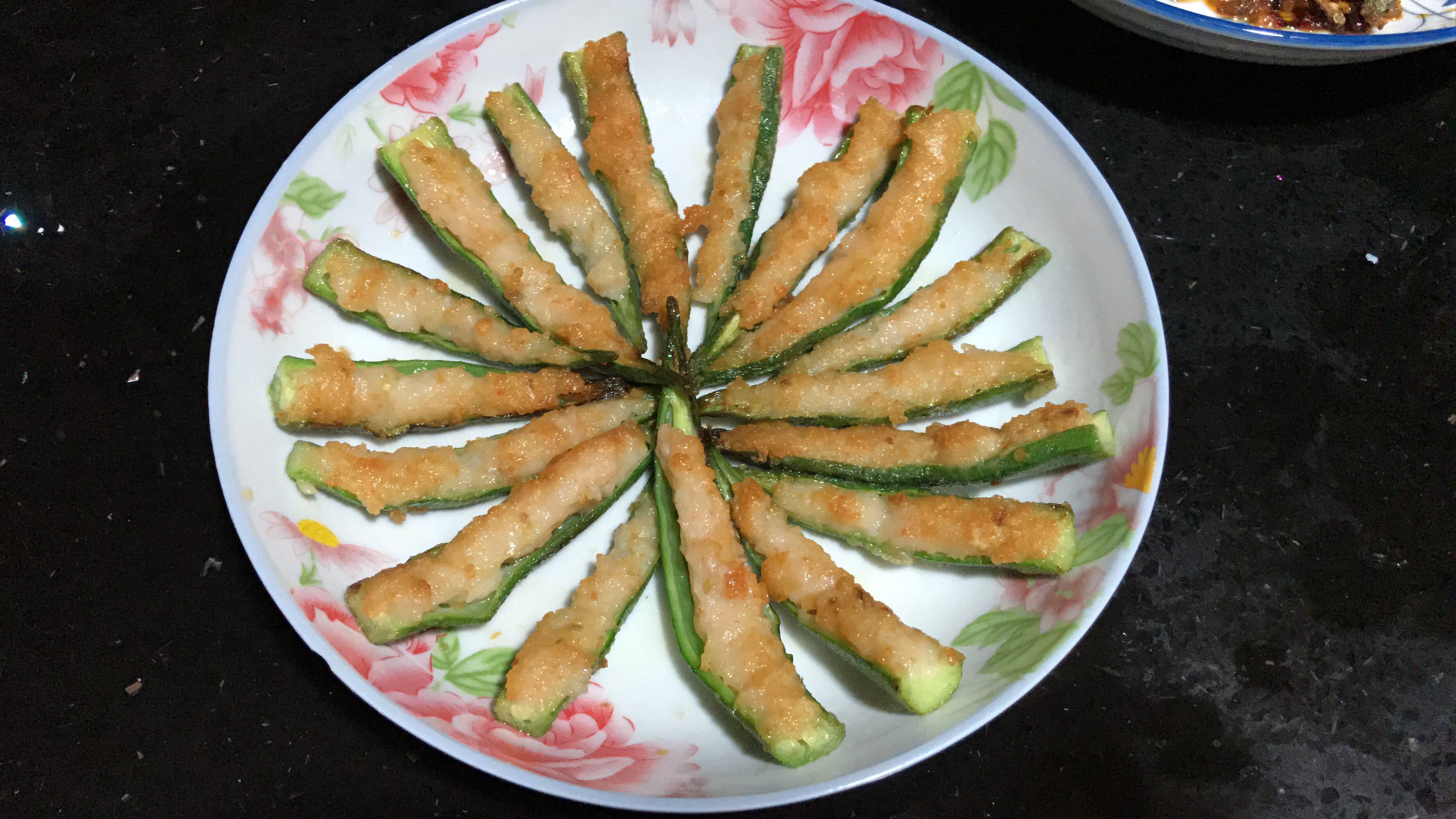 將秋葵中空位置沾上少許生粉,釀入蝦滑。
