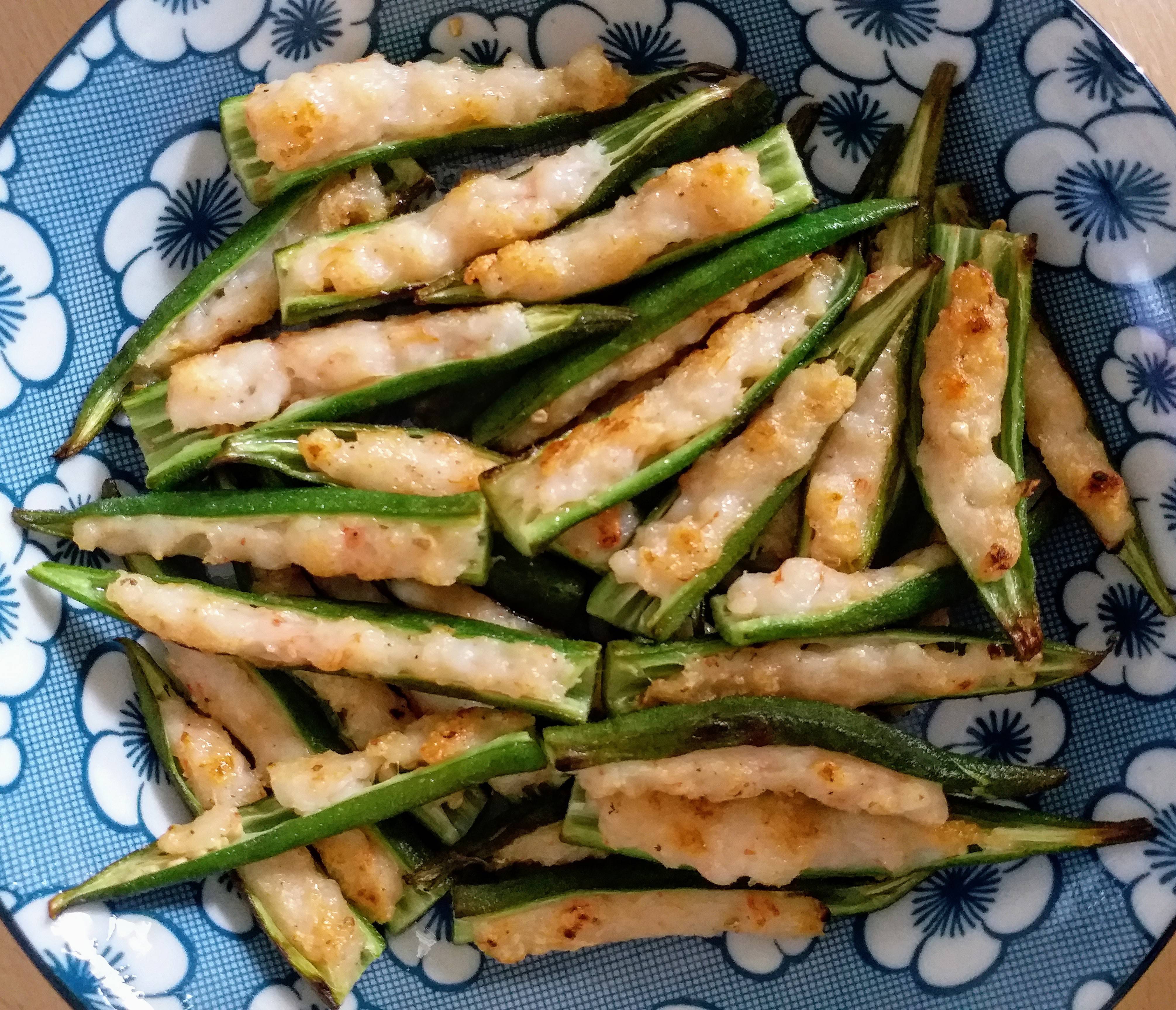 用中火燒熱鍋,加少許油,加入秋葵,蝦滑面朝下,煎至熟透即成。