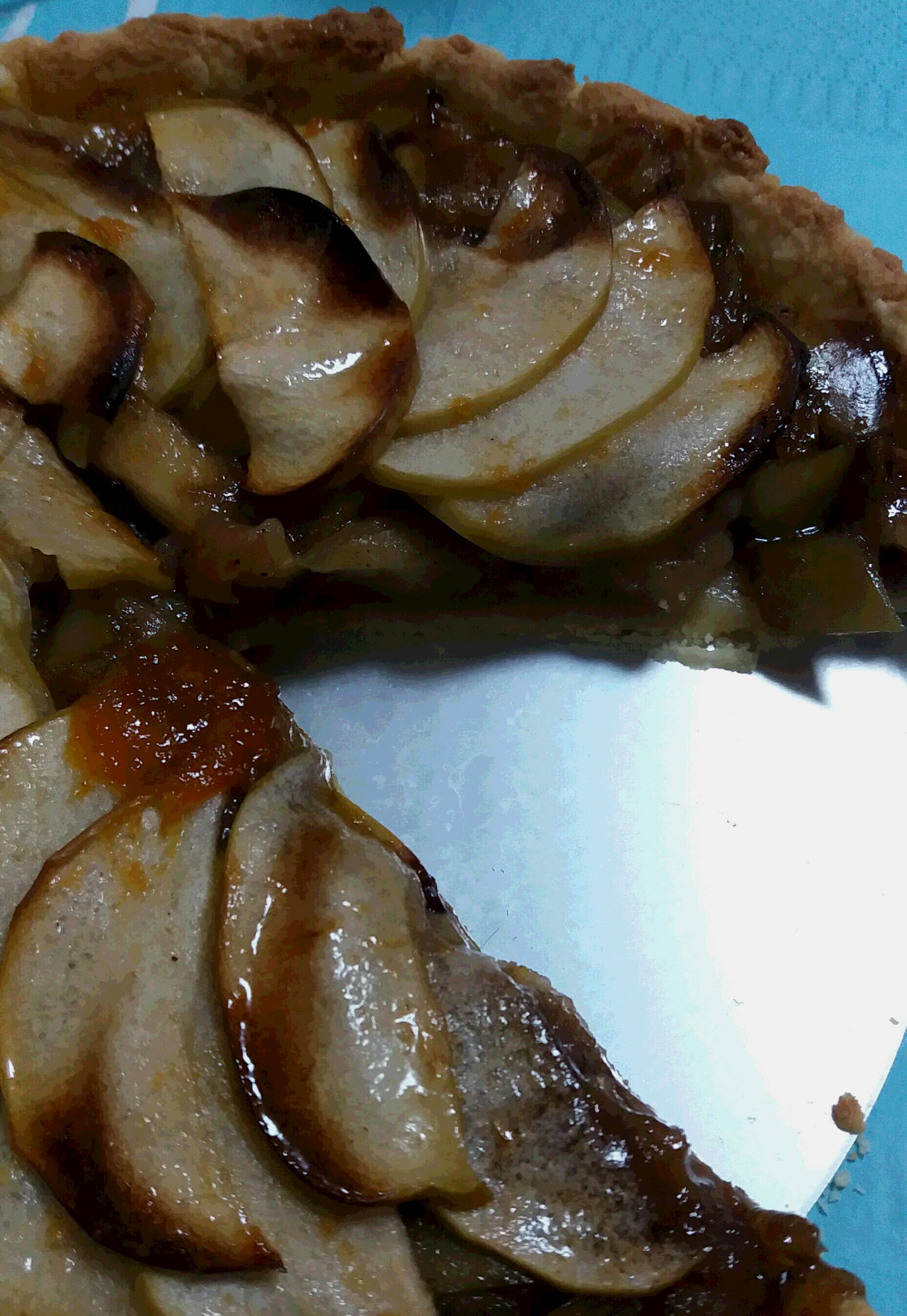 製作餅面塗層,將杏桃果醬、水及砂糖拌勻煮熱,在蘋果批表面掃上一層即成