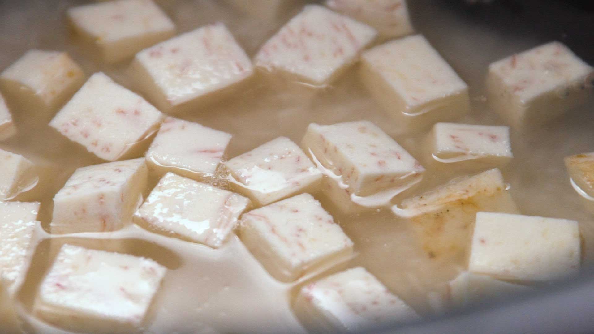 1.將芋頭切粒,紅棗撕開備用;將金象牌頂上茉莉香米洗淨,放入電飯煲,加入椰青水代替水,放入芋頭粒開始煲。