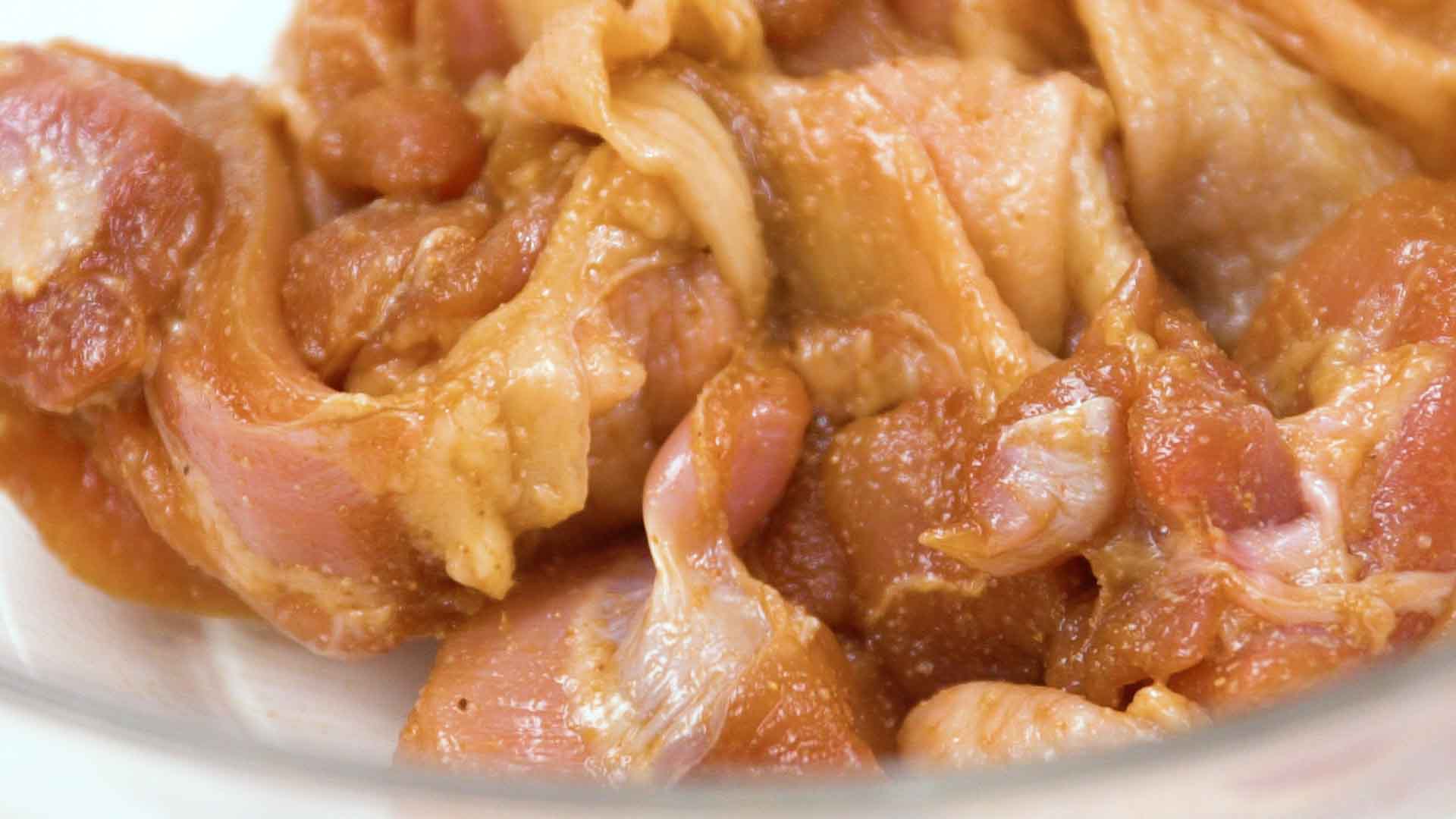 2.將雞髀肉切件,加入沙薑粉及生抽醃15分鐘。