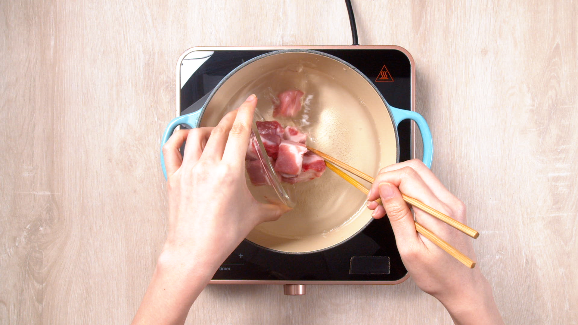 2.木瓜去皮去核切件。排骨凍水落鑊汆水5分鐘,洗淨備用。
